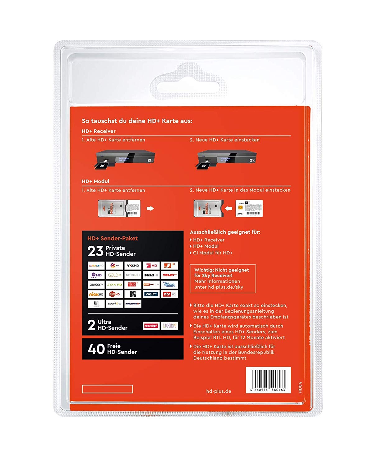 – Notieren Sie sich Ihre 12-stellige HD+ Kartennummer. Diese finden Sie, indem Sie Ihre HD+ Karte aus dem HD+ Receiver oder HD+ Modul ziehen. Auf der Kartenrückseite, unterhalb des Barcodes, finden Sie Ihre HD+ Kartennummer
